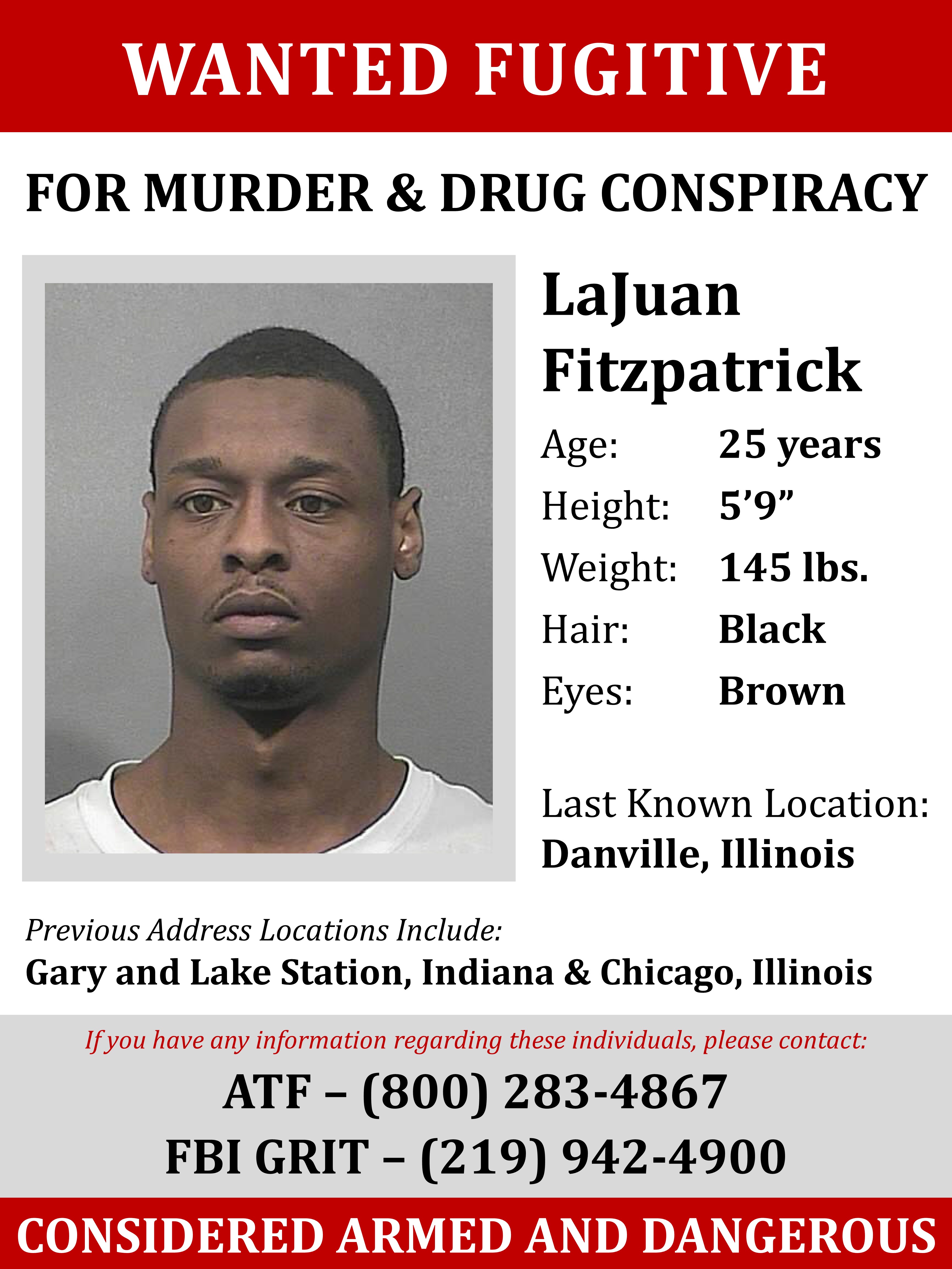 Wanted fugitive for murder and drug conspiracy, LaJuan Fitzpatrick (age 25; height 5 feet 9 inches; weight 145 lbs; hair black; eyes brown) was last seen in Danville, Illinois. Previsou address locaonis include Gary and Lake Station, Indiana and Chicago, Illinois. If you have any information regading this individual, please contact the ATF at (800) 283-4867 or the FBI GRIT at (219) 942-4900. He is considered armed and dangerous.