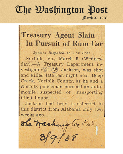 Newspaper article from The Washington Post, dated March 9, 1938, with headline: Treasury Agent Slain In Pursuit of Rum Car