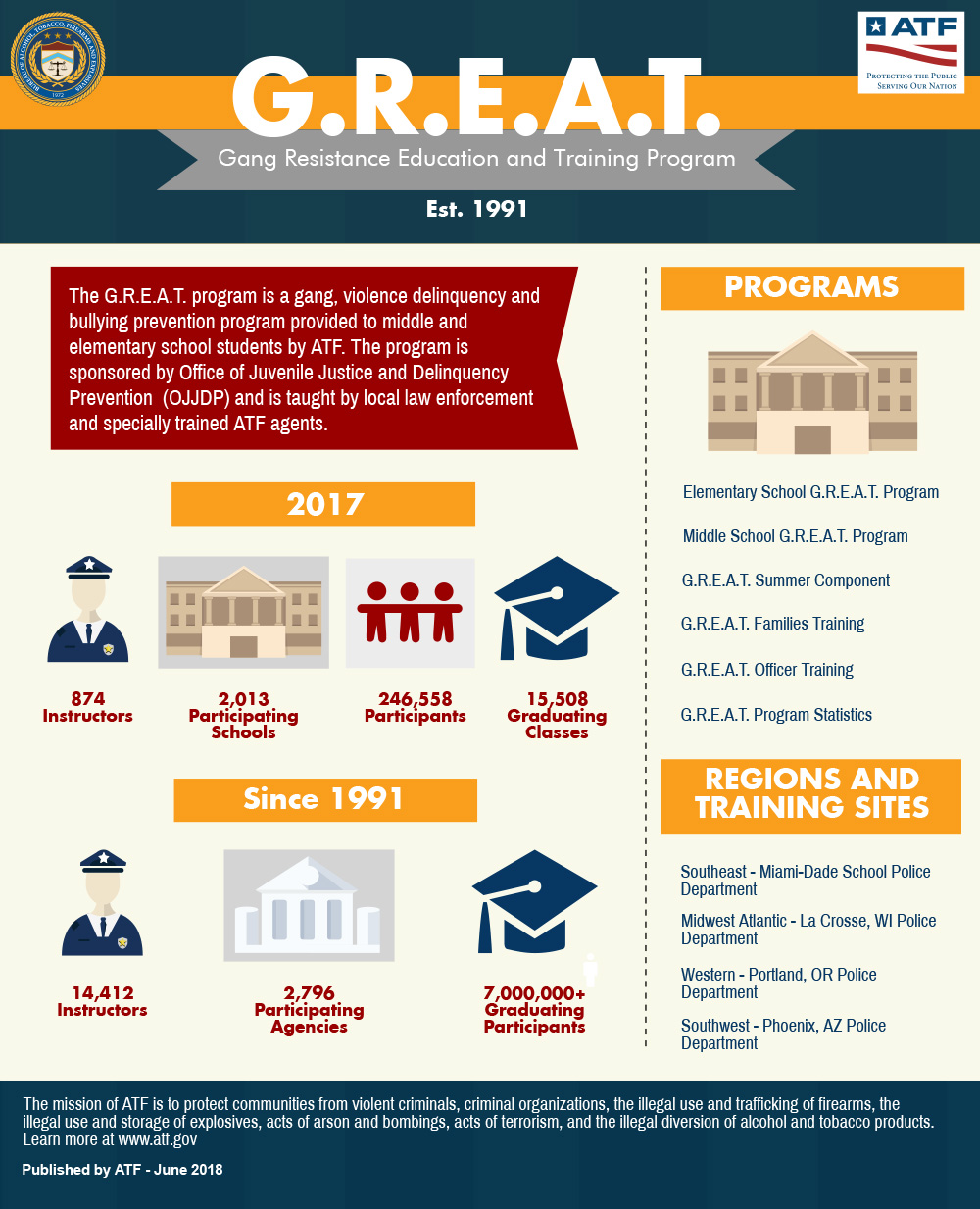 The G.R.E.A.T. program is a gang and violence delinquency and bullying prevention program provided to middle and elementary school students by ATF. The program is sponsored by the Office of Juvenile Justice and Delinquency Prevention (OJJDP). It is taught by local law enforcement and specially trained ATF agents.