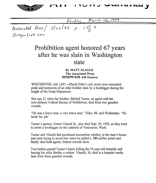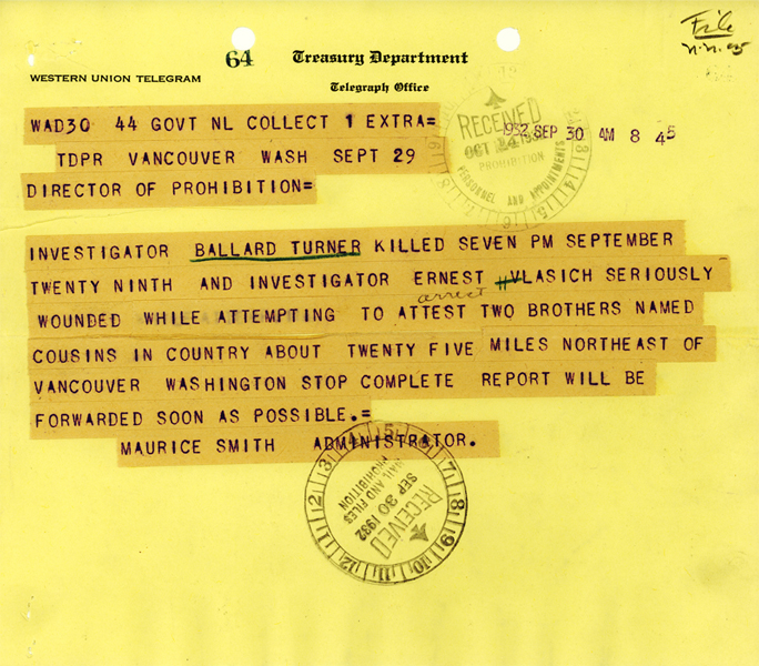 Prohibition Agents Ballard White Turner and Ernest Vlasich went to the home of Jesse Cousins, located about 25 miles NE of Vancouver, WA. The agents had planned to make an undercover purchase of moonshine whiskey. Prohibitions Agents Crowell and Kirby, in a second automobile, parked about 200 yards from the residence to provide security during the operation. The agents successfully purchased 2 gallons of moonshine from Cousins and then advised him that he was under arrest. Without any warning, Cousins drew a .380 caliber pistol and fired at both agents. Agent Turner was struck twice in the heart and died instantly. Agent Vlasich was shot three times and seriously wounded. The back-up agents immediately responded to the house and found the two agents lying in the driveway. Cousins had fled.