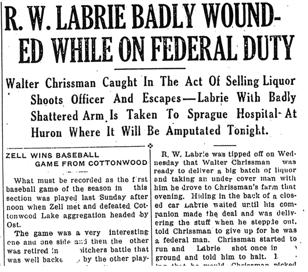 Prohibition Agent Charles Bintliff, Deputy Sheriff Charles Halpin and other officers went to a farm seven miles east of Redfield, SD, to arrest Walter Chrisman. Unknown to the officers, Chrisman was hiding inside a barn. In an ambush, he shot and killed both Agent Bintliff and Deputy Sheriff Halpin. Chrisman escaped to a neighboring farm, but committed suicide as a posse surrounded him. One week prior, Chrisman had shot and wounded Prohibition Agent R. W. Labrie during an attempted arrest for selling liquor. As a result, Agent Labrie's left arm was amputated.
