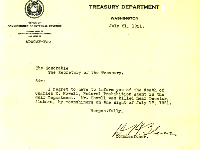 Prohibition Agent Charles Howell and several fellow agents had just completed a still raid in Limestone County, AL. From ambush, a shot rang out and Agent Howell was instantly killed. While a number of individuals were arrested, the person that shot Agent Howell was never identified.