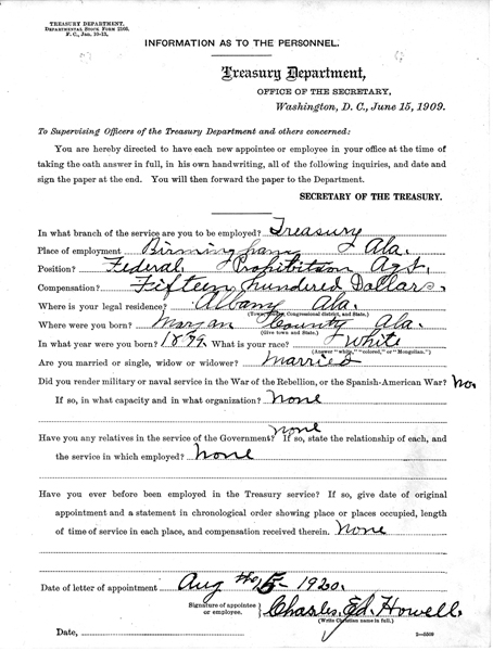 Agent Howell joined the Prohibition Unit on August 15, 1920, with an annual salary of $1,500.