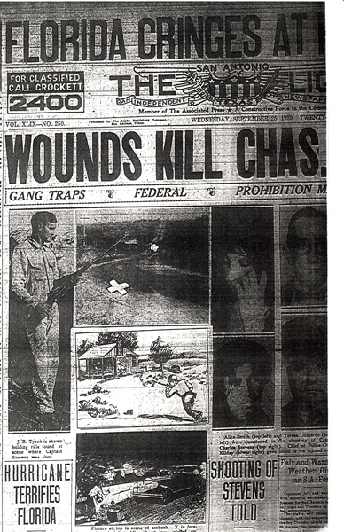 Prohibition Agents Charles Stevens, J. P. Murphy and Robert Hirzel were returning to the San Antonio Office after having seized an illicit distillery about 30 miles south. As they approached San Antonio, they were suddenly ambushed by several men hiding in the woods. During the subsequent gunfight, Agent Stevens was badly wounded. Although he was rushed to the Santa Rose Hospital, he died the following day. In the investigation that followed, Lynn Stephens was identified as one of the persons responsible for the murder of Agent Stevens. He remained a fugitive for 20 years. In 1949, he was arrested, later convicted and sentenced to 38 years imprisonment.
