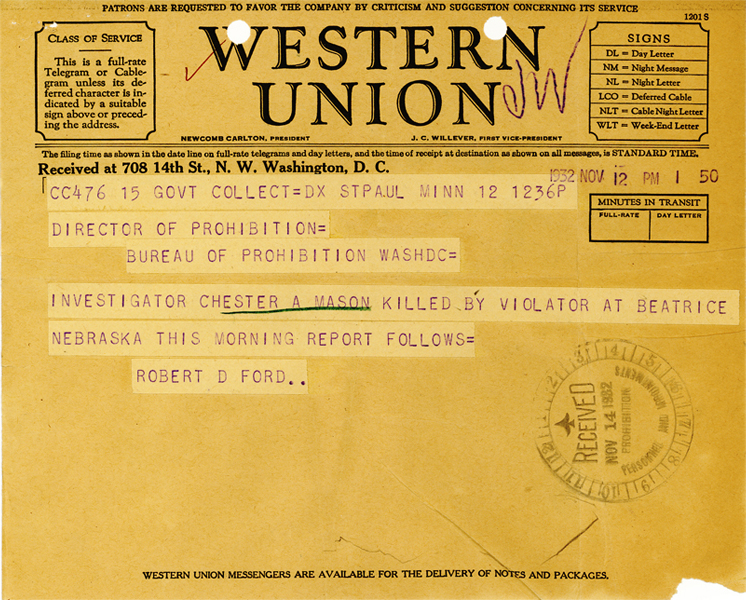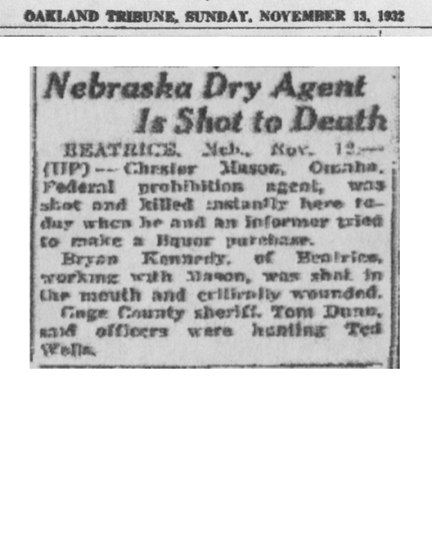 Prohibition Agent Chester Arthur Mason, accompanied by a confidential informant (CI), purchased illicit liquor from a known bootlegger, Ted Wells, in Beatrice, NE. When Agent Mason attempted to place Wells under arrest, there was a scuffle and Wells drew a gun and killed Agent Mason and also seriously wounded the CI. Wells escaped, but was later captured by agents and local officers. He was sentenced to eight years imprisonment for manslaughter.