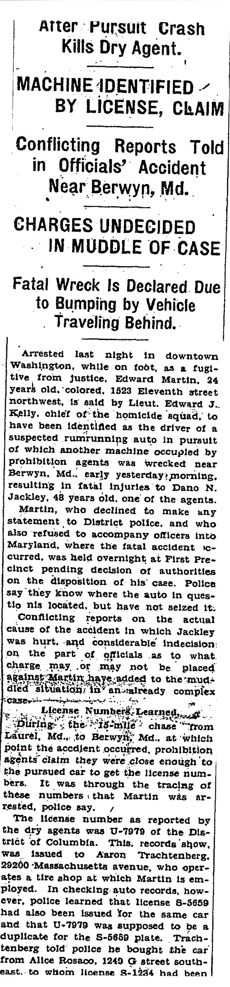 Prohibition Agents Dano Jackley, W. Blandford, Lamar York and Charles McCartney were performing a routine patrol on the Maryland roadways looking for suspicious vehicles transporting liquor. As they drove along Baltimore-Washington Boulevard in Riverdale, they observed a Ford Roadster, which appeared to be loaded with liquor. The agents gave chase for about 15 miles and attempted to overtake the vehicle in Berwyn. However, as they drove along side, the suspect vehicle suddenly turned sharply to the left, catching the front tire of the Government vehicle, causing the agents' car to spin out of control and crash into a telephone pole. The suspect immediately left the scene. In the accident, Agent Jackley was thrown hard to the floor and complained of internal injuries. He was rushed to Providence Hospital in Washington, DC, but later died. The suspect vehicle was later traced to Edward Martin, of Washington, DC. He was identified as the owner and arrested for manslaughter. In court, the agents were unable to identify Mr. Martin as the driver of the Ford Roadster and he was subsequently exonerated by a Coroner's jury. However, Martin was arrested by the U.S. Marshals and charged with assaulting a Federal officer.