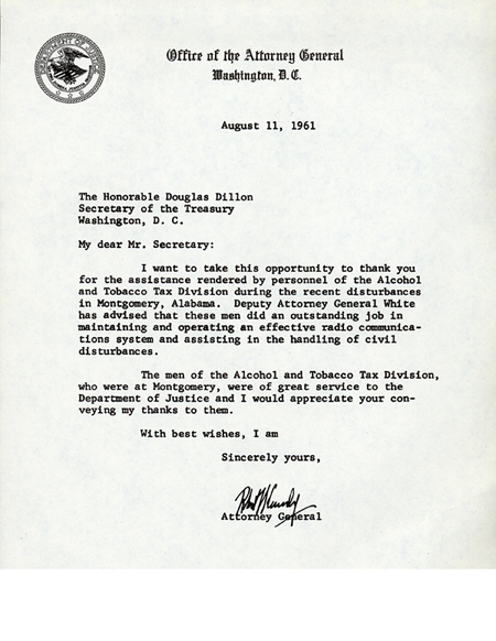 Agent Denney joined the Alcohol and Tobacco Tax Division (ATTD) on November 21, 1955. In 1961, Agent Denney (along with other ATTD agents) received a commendation from Attorney General Robert Kennedy for his excellent law enforcement assistance during civil unrest in Montgomery, Alabama. He also received a commendation in 1958 for his "raw materials" investigation of a major liquor violator, which led to many arrests and seizures. Agent Denney was a U.S. Marine Corps veteran, having proudly served during World War II.