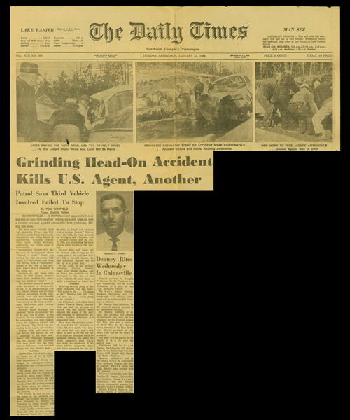 Special Agents Douglas Flanigen Denney and James Stratigos were traveling in a government car on Highway 53, NE of Dawsonville, Georgia. As they drove along in the right traffic lane, they observed two cars (possibly drag racing) driving side by side and approaching them at a high rate of speed. Before they could take evasive action, one of the two cars crashed head-on into the government car, instantly killing Agent Denney and seriously injuring Agent Stratigos. The passenger in the other car was also instantly killed while the driver died several days later.