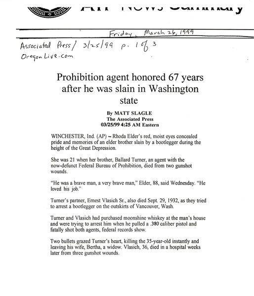 Prohibition Agents Ernest Benedict Vlasich and Ballard Turner went to the home of Jesse Cousins, located about 25 miles NE of Vancouver, WA. The agents had planned to make an undercover purchase of moonshine whiskey. Prohibitions Agents Crowell and Kirby, in a second automobile, parked about 200 yards from the residence to provide security during the operation. The agents successfully purchased 2 gallons of moonshine from Cousins and then advised him that he was under arrest. Without any warning, Cousins drew a .380 caliber pistol and fired at both agents. Agent Turner was struck twice in the heart and died instantly. Agent Vlasich was shot three times and seriously wounded. The back-up agents immediately responded to the house and found the two agents lying in the driveway. Cousins had fled.