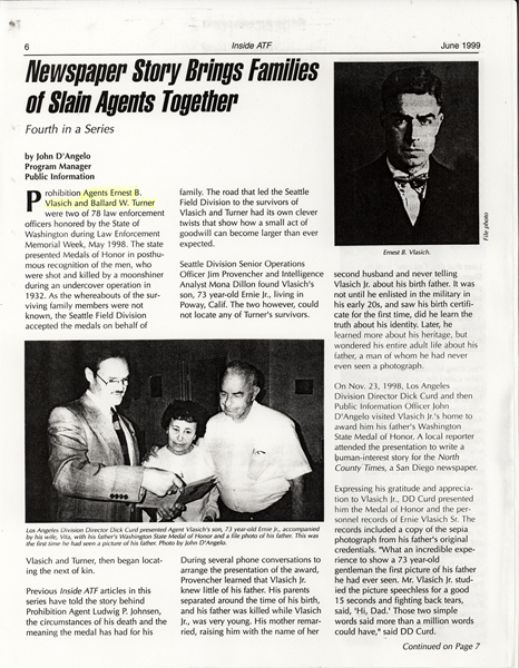 Agent Vlasich was born in Seattle, WA. He was survived by his wife, Vasa (née Murray) and their daughter, Mary Ann (who was born 13 days after he died). Agent Vlasich also had two sons from a previous marriage, Ernest, Jr. and Fred William Vlasich.