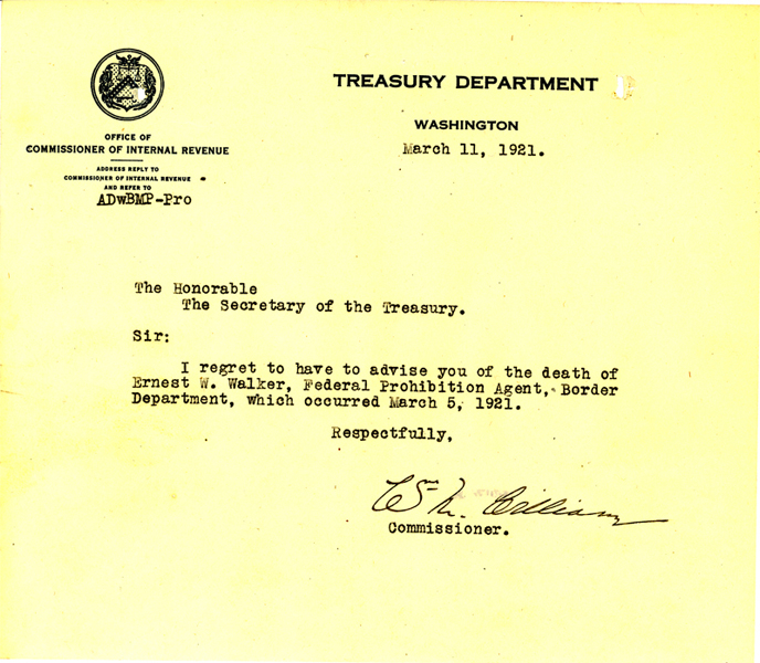 Agent Walker joined the Prohibition Unit on February 11, 1920, with an annual salary of $1,400. He started his government service in 1917, as a tax collector for the IRS.