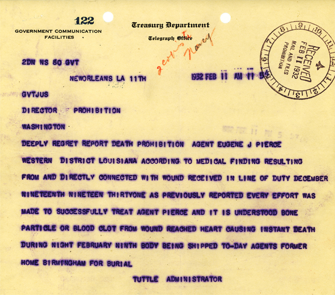 On December 18, 1931, Prohibition Agents Eugene Joseph Pearce, Paul Hornaday and W. H. Chilton were patrolling the roads near Alexandria, LA, looking for liquor transporters. They observed Chester Campbell driving a Ford Touring car at a high rate of speed. Campbell, a known violator, was accompanied by three other suspects. The agents chased the car for approximately 12 miles before forcing it to the side of the road. Campbell, in an effort to escape, took off running with Agent Pearce in hot pursuit. When Agent Pearce caught up with him, they struggled for several minutes before Agent Hornaday arrived to assist. Campbell grabbed a gun and in the tussle that followed, Agent Pearce was shot in the left arm.