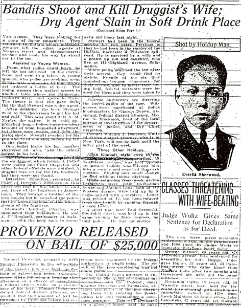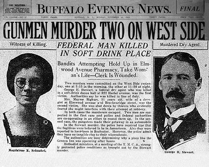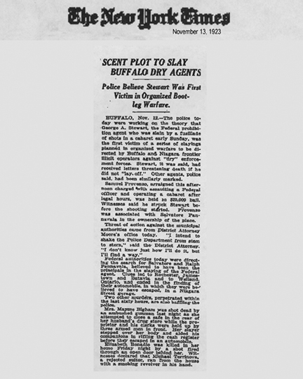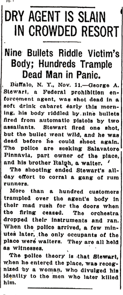Prohibition Agent George Stewart, working undercover, entered a "soft-drink" cafe in Buffalo, NY, to purchase illicit liquor. A female patron apparently recognized Agent Stewart and tipped off the owner. As Agent Stewart departed the store, he was shot nine times by two suspects. Although badly wounded, he managed to draw his own weapon and fire once. Agent Stewart died at the scene. Brothers Sam and Ralph Pannavaia were later identified as being responsible for the killing and arrested.