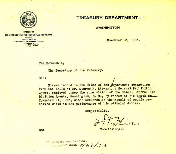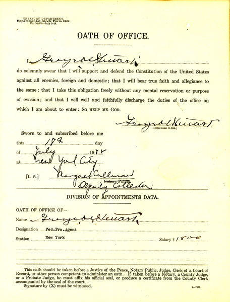 Agent Stewart joined the Prohibition Unit on July 18, 1922, with an annual salary of $1,800.