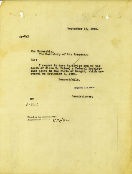 Agent Price joined the Prohibition Unit on February 15, 1922, with an annual salary of $1,800. He carried badge number #2152.