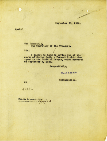 Agent Todd joined the Prohibition Unit on April 10, 1922, with an annual salary of $1,800.