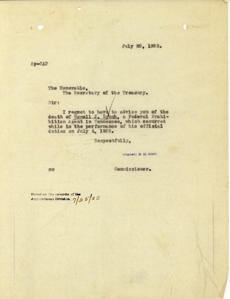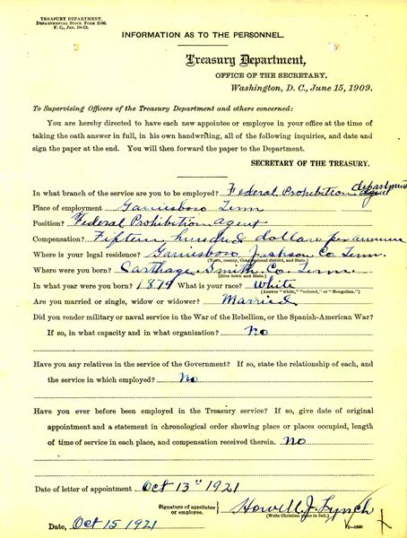 Agent Lynch joined the Prohibition Unit on October 13, 1921, with an annual salary of $1,500.