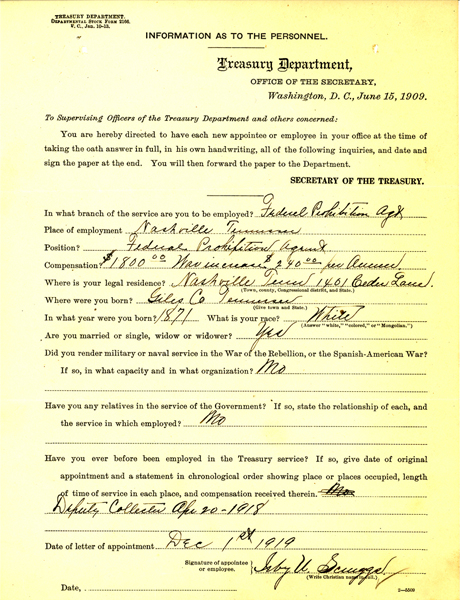 Agent Scruggs joined the Prohibition Unit on December 1, 1919, with an annual salary of $1,871. He was among the first prohibition agents assembled to enforce the Volstead Act, which took effect on January 16, 1920.