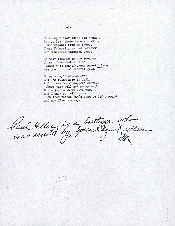 In 1929, Paul Hiller, a bootlegger, wrote a poem about Agent Wilson's exploits and how he had worked undercover loading boats with illicit liquor until one day, Hiller found himself arrested by Agent Wilson. This poem appears as an attachment at the end of this file. In June 1931, Agent Wilson was appointed Agent in Charge of the Indianapolis, IN, field office. Agent Wilson served in the U.S. Navy from 1917 - 1919 and the U.S. Army from 1922 - 1927.