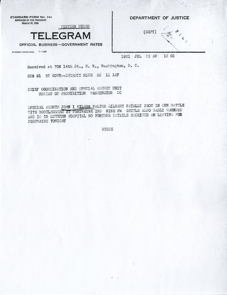 Prohibition Agents John Irwin Wilson, Oliver Cetteland and Walter Gilbert had arranged to make an undercover purchase of illicit liquor from George Adams in Fort Wayne, IN. Adams, a convicted felon, was on recent parole from prison for a previous Federal liquor violation. Agents Wilson and Gilbert were accompanied by additional agents in separate automobiles. They proceeded to the agreed upon meeting location, on the lower Huntington Road near Waynesdale, in Allen County.
