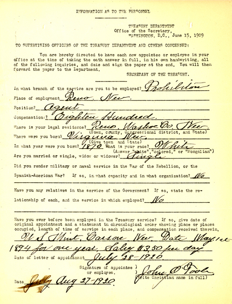 Agent O'Toole joined the Prohibition Unit on August 27, 1920, with an annual salary of $1,800.