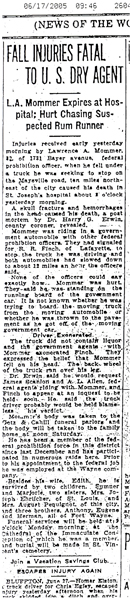 Prohibition Agents Lawrence Mommer, James Scanlon, Herman Finch, A. L. Allen, and Thomas Scott were patrolling the highways for rum-runners around Fort Wayne, IN. At about 12:45 a.m., on Maysville Road, outside of Fort Wayne, the agents began a pursuit of a "Reo Speed Wagon," which they suspected was loaded with whiskey. The suspect driver had been ordered to stop and the two vehicles were driving side by side at about 10 mph. Agent Mommer stepped to the running board of the Government vehicle. While attempting to board the suspect vehicle, he slipped and was crushed by its rear wheel. Agent Mommer was rushed to the local hospital, but passed away that same morning.
