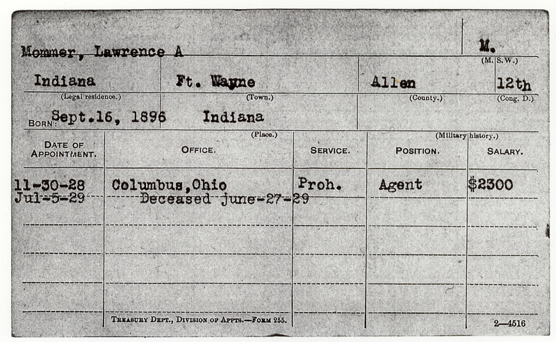 Agent Mommer joined the Bureau of Prohibition on November 30, 1928, with an annual salary of $2,300.