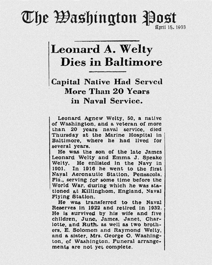 Agent Welty was born in Washington, DC.  He was survived by his wife and their five children, Florence, James, Edna, Charlotte and Ruth.
