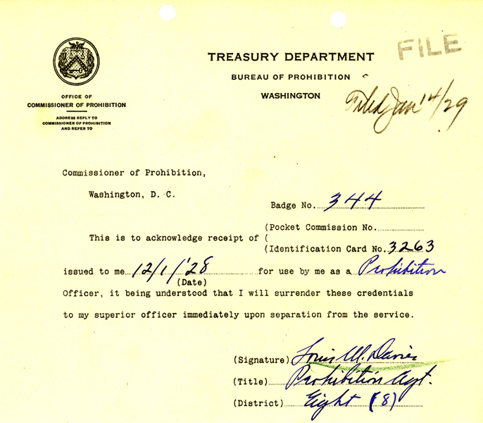 Agent Davies joined the Bureau of Prohibition on December 1, 1928. He carried badge #344.