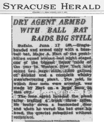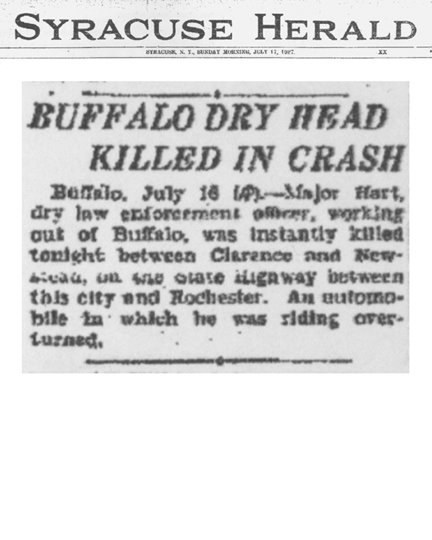 Prohibition Agent Major Hart had conducted a special investigation in Rochester, NY. While returning to Buffalo, NY, to brief his supervisor, he was involved in an automobile accident, where his Government vehicle overturned. Agent Hart died at the scene.