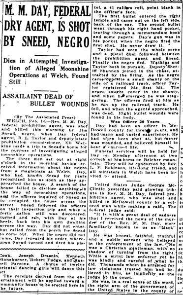 Prohibition Agent Malcolm "Mack" Day and other agents were executing a federal search warrant for illicit liquor on the property of Jim Sneed near Welch, WV. During the search, Sneed ran into his house, retrieved a gun and shot and killed Agent Day. Other prohibition agents then shot and killed Sneed.