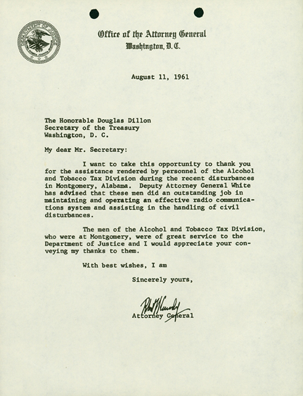During his career, Agent Holt was the recipient of numerous letters of commendation for his outstanding investigative work and professionalism while carrying out his duties. In 1961, Agent Holt (along with other ATTD agents) received a commendation from Attorney General Robert Kennedy for his outstanding law enforcement assistance during civil unrest in Montgomery, Alabama.