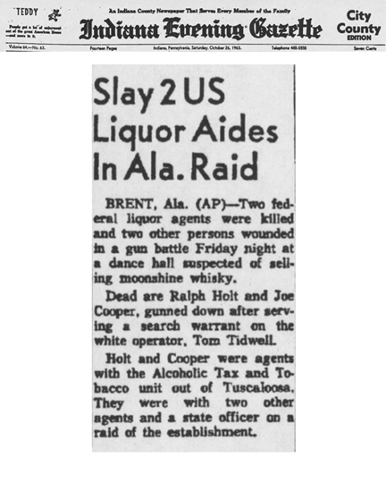 On October 25, 1963, Special Agents Ralph Holt, Joe Cooper, Richard Dickinson, S. B. Whitlow and Alabama Beverage Control Agent Harold Hartranft executed a federal search warrant at Club 92, a dance hall about five miles southwest of Brent, Alabama. The dance hall was operated by Tod Tidwell.