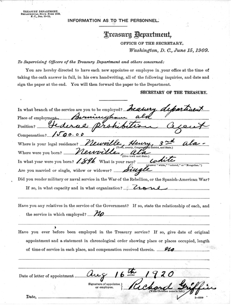 Agent Griffin joined the Prohibition Unit on August 16, 1920, with a salary of $1,500 per year.