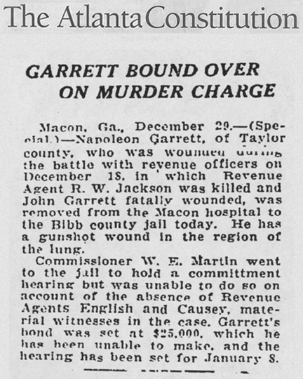 Prohibition Agents Richard Jackson and S. J. Causy along with Police Captain Edward English raided and seized a still and arrested three suspects in Taylor County, GA. While transporting the prisoners to the local jail, the agents came under attack from ambush by brothers, John and Napoleon Garrett. The brothers, who actually owned the seized still, demanded that the prisoners be released. The agents refused. During the ensuing gun battle, Agent Jackson and John Garrett were killed and Napoleon Garrett was seriously wounded.
