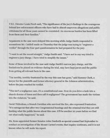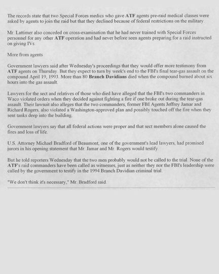 Contrary to popular news reports, the Davidian compound was actually located in the unincorporated area of McLennan County, and not within the city limits of Waco. The people of Waco were very supportive of law enforcement and often brought food to the agents and populated their front yards with homemade signs of support for what law enforcement was trying to accomplish.