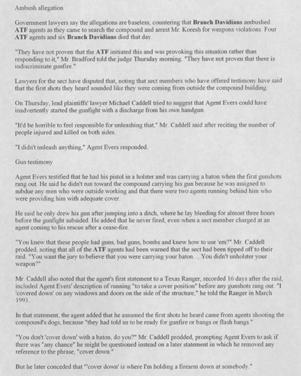 A long and difficult gunfight followed over approximately 2 1/2 hours, with agents unable to penetrate the main house and having little natural cover to protect themselves from the Davidian gunfire. The Davidians had excellent cover and the tactical advantage had shifted to them.