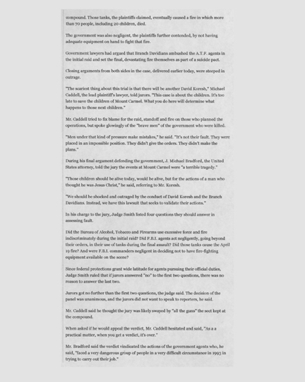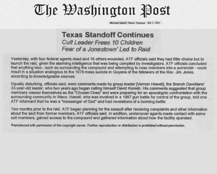 A 51-day stand-off ended on April 19th when the Davidian Compound erupted in fire(s) set by cult members, as law enforcement attempted to force them out by introducing tear gas into the building. The fire destroyed the compound and more than 70 residents were killed, many from gunshot wounds apparently inflicted by fellow cult members. Nine cult members escaped the fire and were arrested, while eight of those members were later convicted in federal court on various firearms and/or other charges; all were sentenced to various lengths of imprisonment.