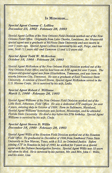 On February 28, 1993, Special Agent Robert John Williams was part of a large, specially trained and well disciplined force of ATF special agents from the Dallas, Houston and New Orleans Field Divisions, assigned to execute federal warrants at the Branch Davidian Compound. Unfortunately, the Davidians had been alerted to the impending raid by a local postman, who was also a cult member.