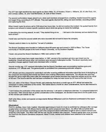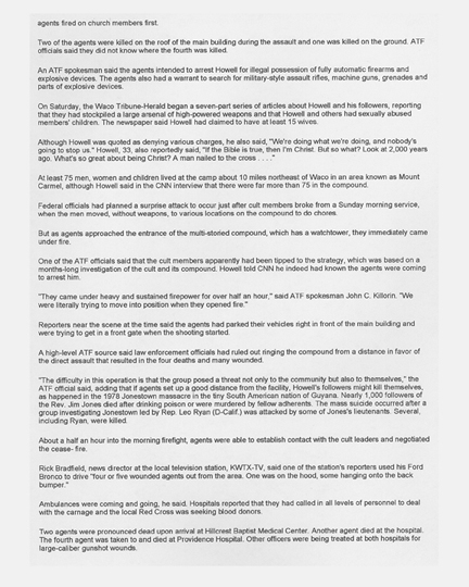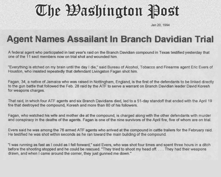 When the agents arrived, the fanatical, heavily armed, cult members were waiting in ambush as the agents disembarked from their vehicles. Koresh was outside on the porch, but as the agents approached, telling him they had a search warrant and instructing him to "get down," he retreated inside the house. When the agents approached, a burst of gunfire was fired through the door, wounding one agent.