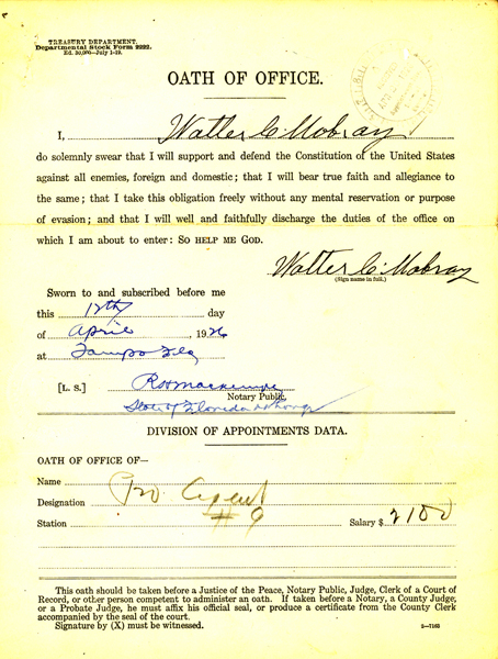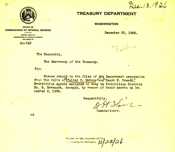 Agent Mobray joined the Prohibition Unit on May 25, 1925, with an annual salary of $1,680.