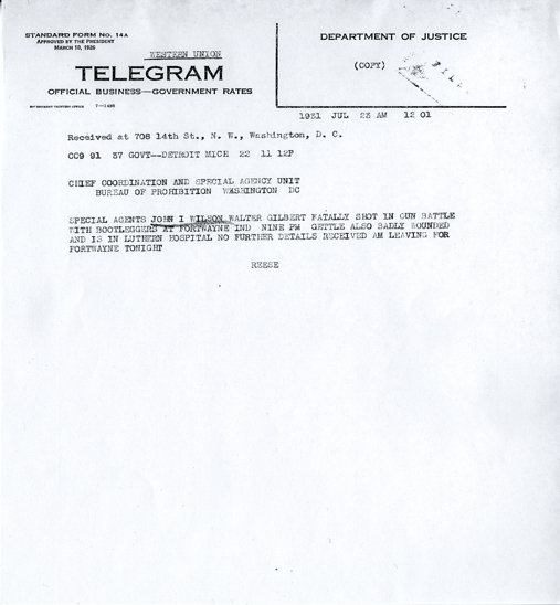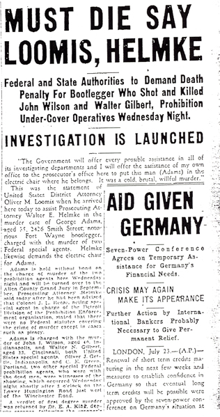 Prohibition Agents Walter Gilbert, John Wilson and Oliver Cetteland had arranged to make an undercover purchase of illicit liquor from George Adams in Fort Wayne, IN. Adams, a convicted felon, was on recent parole from prison for a previous Federal liquor violation. Agents Wilson and Gilbert were accompanied by additional agents in separate automobiles. They proceeded to the agreed upon meeting location, on the lower Huntington Road near Waynesdale, in Allen County.