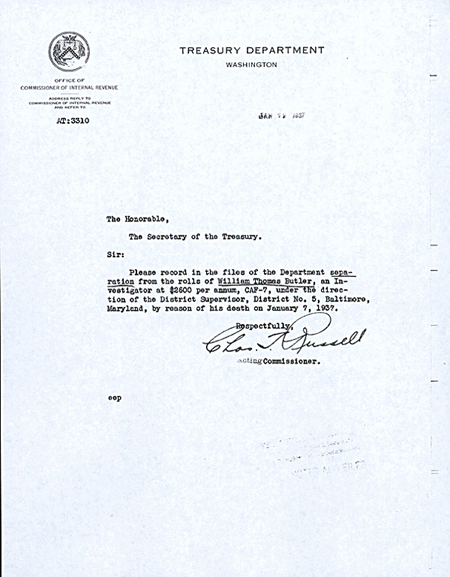 Agent Butler joined the Alcohol Tax Unit (ATU) on July 9, 1934. Agent Butler previously served as a Prohibition Agent in the Bureau of Prohibition, Department of Justice; however, no further information could be found regarding his service.