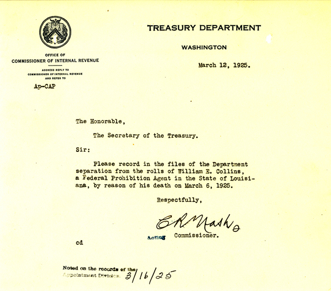 Agent Collins joined the Prohibition Unit on February 26, 1923, with an annual salary of $1,800. Previously, he was a schoolteacher.
