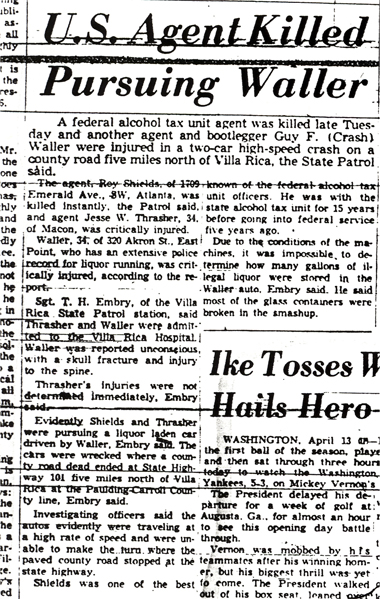 Special Agents William LeRoy Shields and Jesse Thrasher were patrolling the highways for bootleggers hauling liquor in Haralson County, Georgia. During their patrol, the agents got into a high speed pursuit of a 1950 Oldsmobile, driven by Guy (Crash) Waller, a well known bootlegger. During the pursuit, both vehicles crashed at the intersection of Temple Road and Rt. 101, on the Carroll-Paulding County line. Agent Shields was killed instantly. Agent Thrasher and Guy Waller were seriously injured and taken to Villa Rica Hospital. Numerous broken glass jugs of moonshine were later found inside Waller's car.
