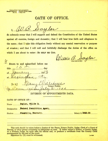 Agent Saylor joined the Prohibition Unit on January 15, 1923, with an annual salary of $1,600.