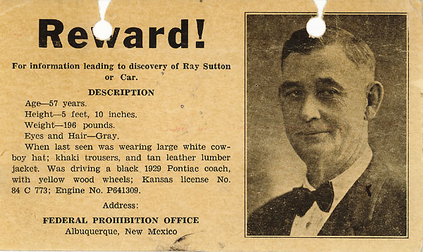 Before becoming a Prohibition agent, Sutton was a well-known figure in the county. He served several terms as the sheriff of Clayton, held other local offices and served as a vice-president of a bank. Sutton had been a Prohibition agent seven years to the month when he mysteriously disappeared while investigating a ring of bootleggers in northern New Mexico and southern Colorado. He had been working out of Raton and living at the Hotel Seaberg since Aug. 22.