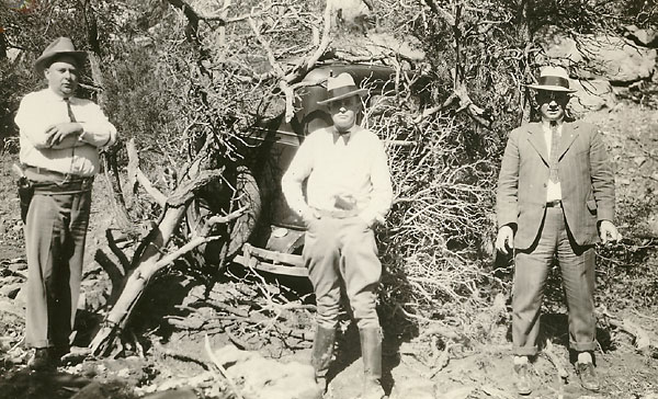Searchers pose in front of Sutton's partially visible sedan, still hidden by underbrush. Photo courtesy of ATF Historic Archives.