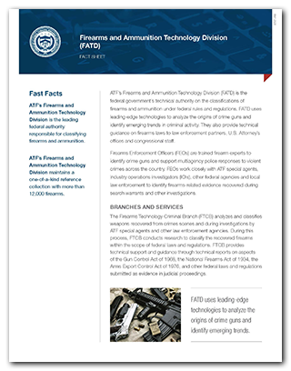 ATF’s Firearms and Ammunition Technology Division (FATD) is the federal government’s technical expert on classifying firearms and ammunition under federal statutes and regulations. FATD uses leading-edge technologies to analyze the origins of crime guns and identify emerging trends in criminal activity. They also provide technical guidance on firearms laws to law enforcement partners, U.S. Attorney’s offices and congressional staff.