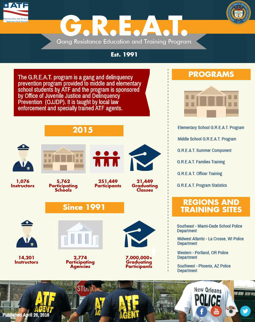 The G.R.E.A.T. program is a gang and delinquency prevention program provided to middle and elementary school students by ATF and the program is sponsored by the Office of Juvenile Justice and Delinquency Prevention (OJJDP). It is taught by local law enforcement and specially trained ATF agents.